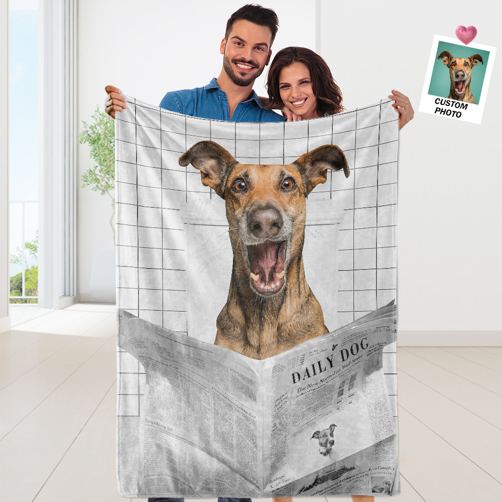 Custom Funny Pet Portrait Blanket Dog Read Newspaper in Toilet Blanket
