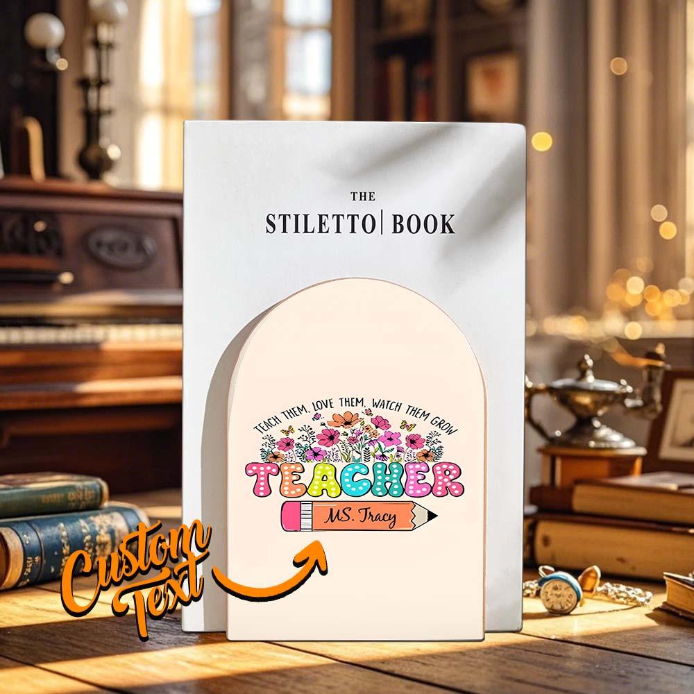 Personalized Wood Bookends with Name Pencil Floral Bookend Back to School Gift for Teacher