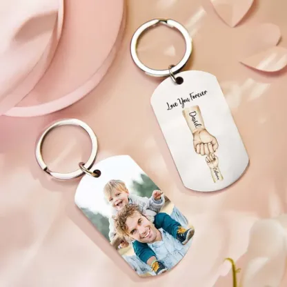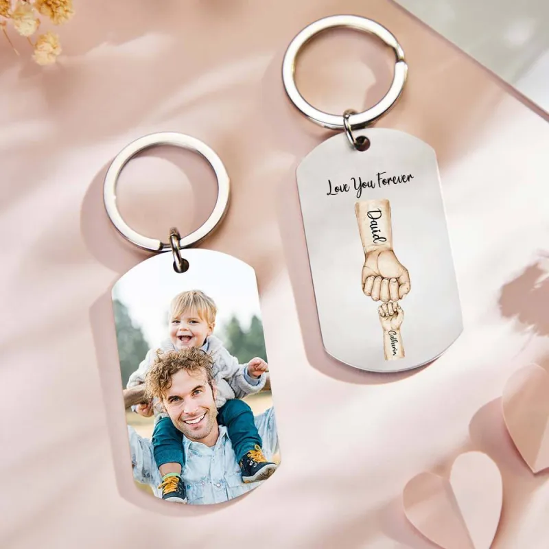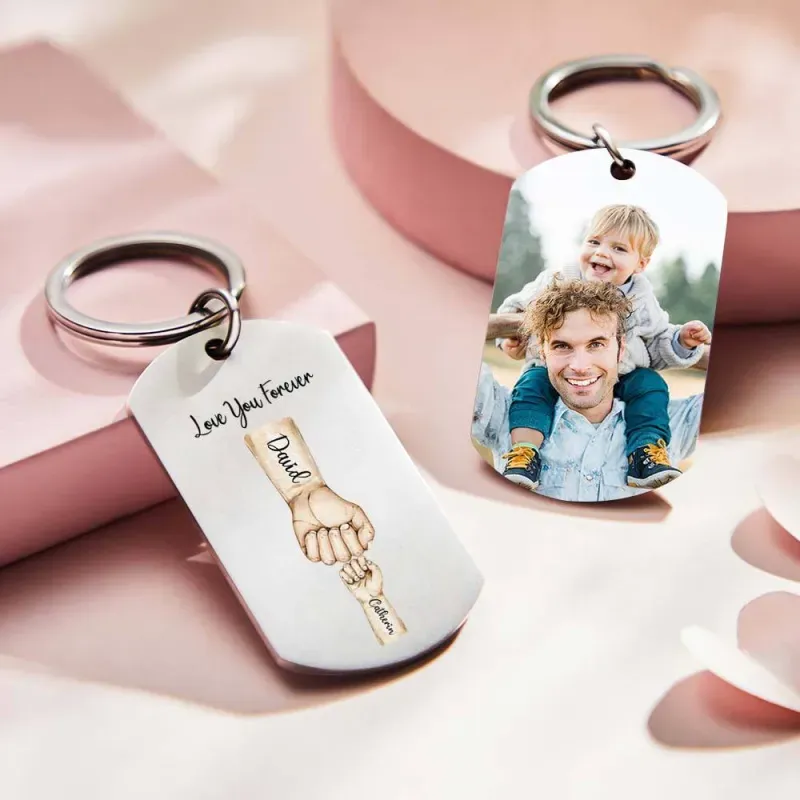 The personalized keychain features a main fist design representing a father and the option to customize 1-5 smaller fist designs, along with the ability to personalize with 1-5 names and a title, and the option to customize a photo is a meaningful gift for birthdays, Father's Day, anniversaries, family gatherings, Christmas, first Father's Day, and new car celebrations for fathers, sons, husbands, grandfathers, and family members.