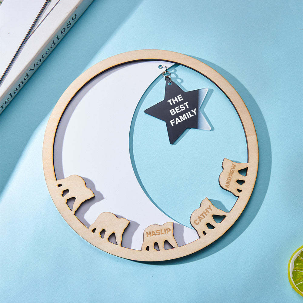 This is a personalized bear, moon and star wall plaque. The stars can be engraved with any text you like. The number of bears will be cut in ascending order of size, each with a personalized name, but if you prefer a simpler style, you can choose to leave it blank. Can be used as gifts for Christmas, Anniversary, Mother's Day, to boyfriends, husbands and wives, parents, brothers.