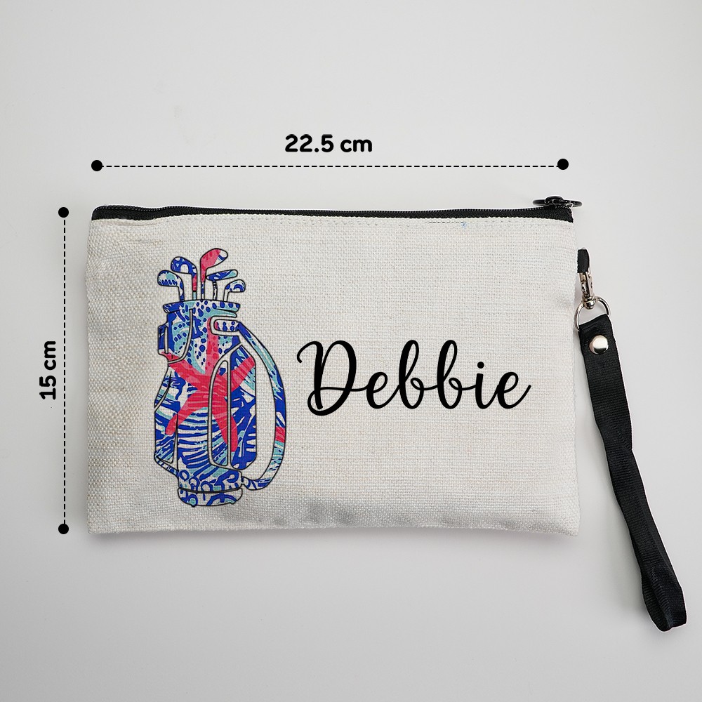 Customize it with your name or initials alongside a sleek golf bag design, creating a unique and personal touch. Whether you're a golf enthusiast or looking for a thoughtful gift, this makeup bag offers style and practicality. Its compact size fits easily into larger bags, suitcases, or even your golf gear.