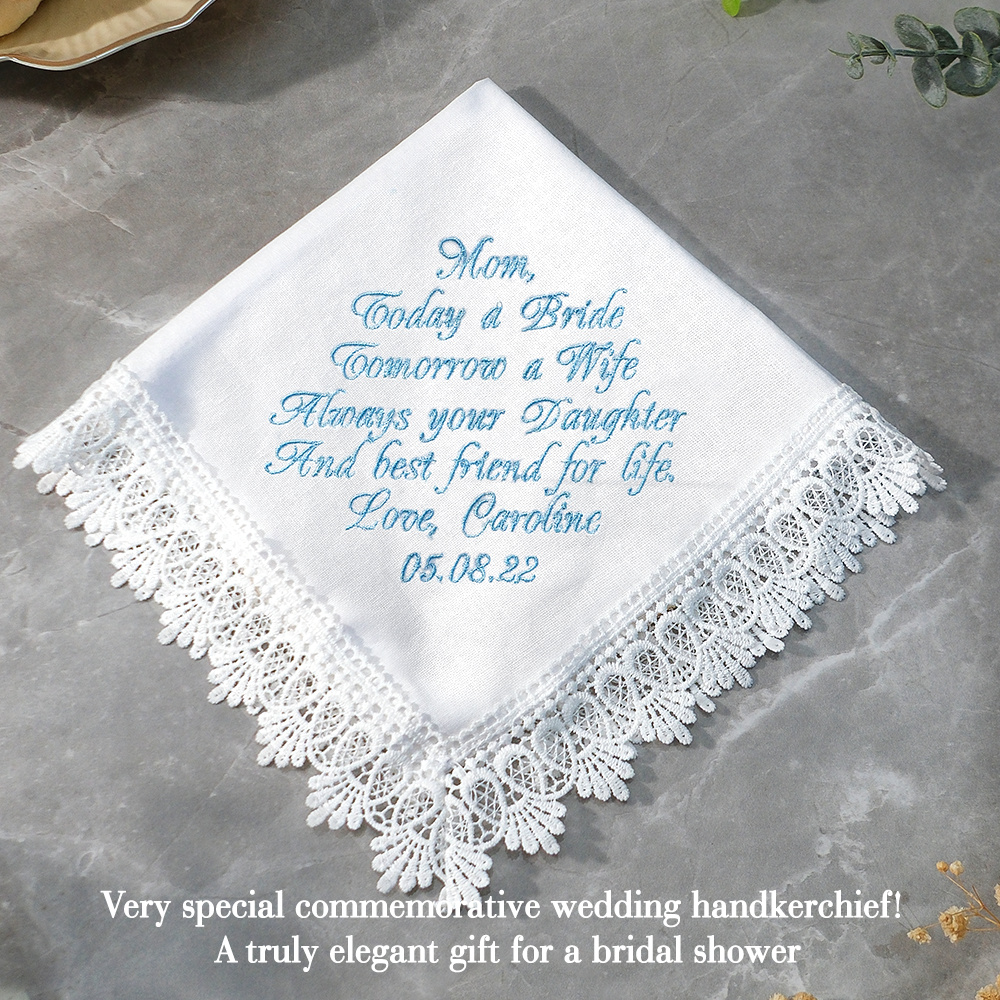 Elevate your wedding gift game with our Personalized Wedding Handkerchief. Made of high-quality material, this embroidered hankie is a unique and sentimental gift for the mother of the bride. Customized with her text, it's a special keepsake that will be cherished for years to come. Gift with love and thoughtfulness.